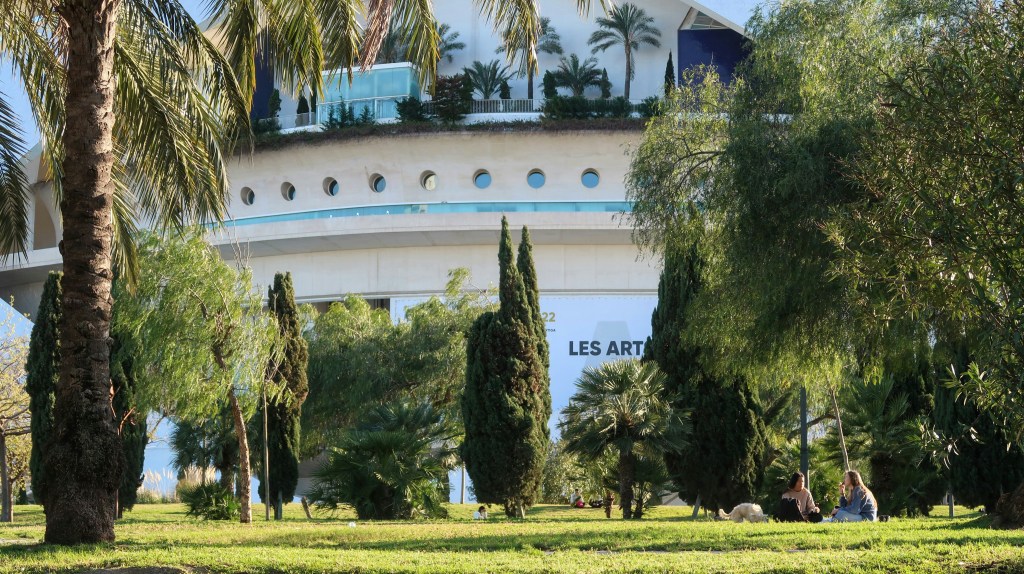 Gli edifici della Città delle Arti e delle Scienze hanno forme sinuose e futuristiche. Il complesso include strutture iconiche come l’Hemisfèric, a forma di occhio, il Museo delle Scienze, che ricorda uno scheletro di balena, e l’Umbracle, una lunga passeggiata coperta da un arco di piante. Il bianco degli edifici di Calatrava si riflette nelle piscine circostanti, creando un’atmosfera unica e affascinante. Attorno a queste piscine di un azzurro intensissimo, le persone si aggirano con il desiderio di buttarcisi, ma nessuno osa farlo per primo (e forse è anche vietato).