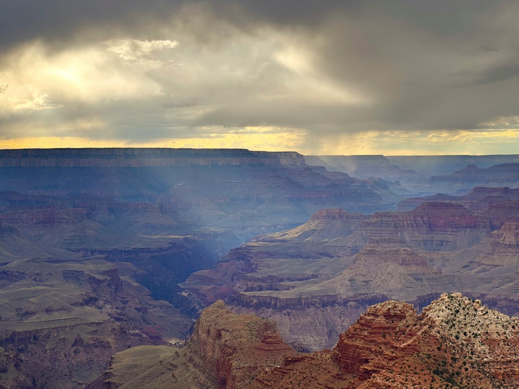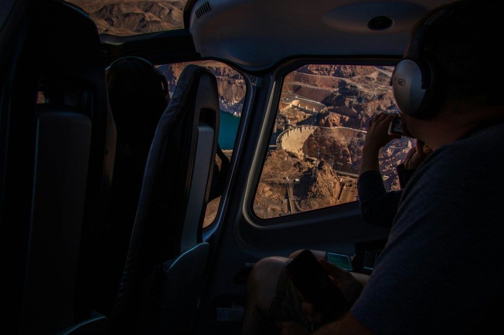 Oggi abbiamo sorvolato il Grand Canyon in elicottero. È stato un investimento, e mi sono sentita un po’ male quando ho aperto il portafoglio, ma lo consiglio a tutti. Dall’alto, il Canyon si estende a perdita d’occhio, con i suoi crepacci colorati e le gole che sembrano colpi di accetta. In fondo, corre il Colorado, fangoso e pieno di rapide, mentre intorno nuvole nere e saette creavano un’atmosfera drammatica.