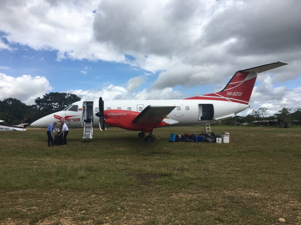Quando atterriamo (su un prato, ovviamente), assistiamo a uno spettacolo da manuale: la porta della cabina di pilotaggio si apre, cade un pezzo di copertura e, dalla prima fila, cade giù una mascherina per l’ossigeno. Benvenuti a La Macarena.