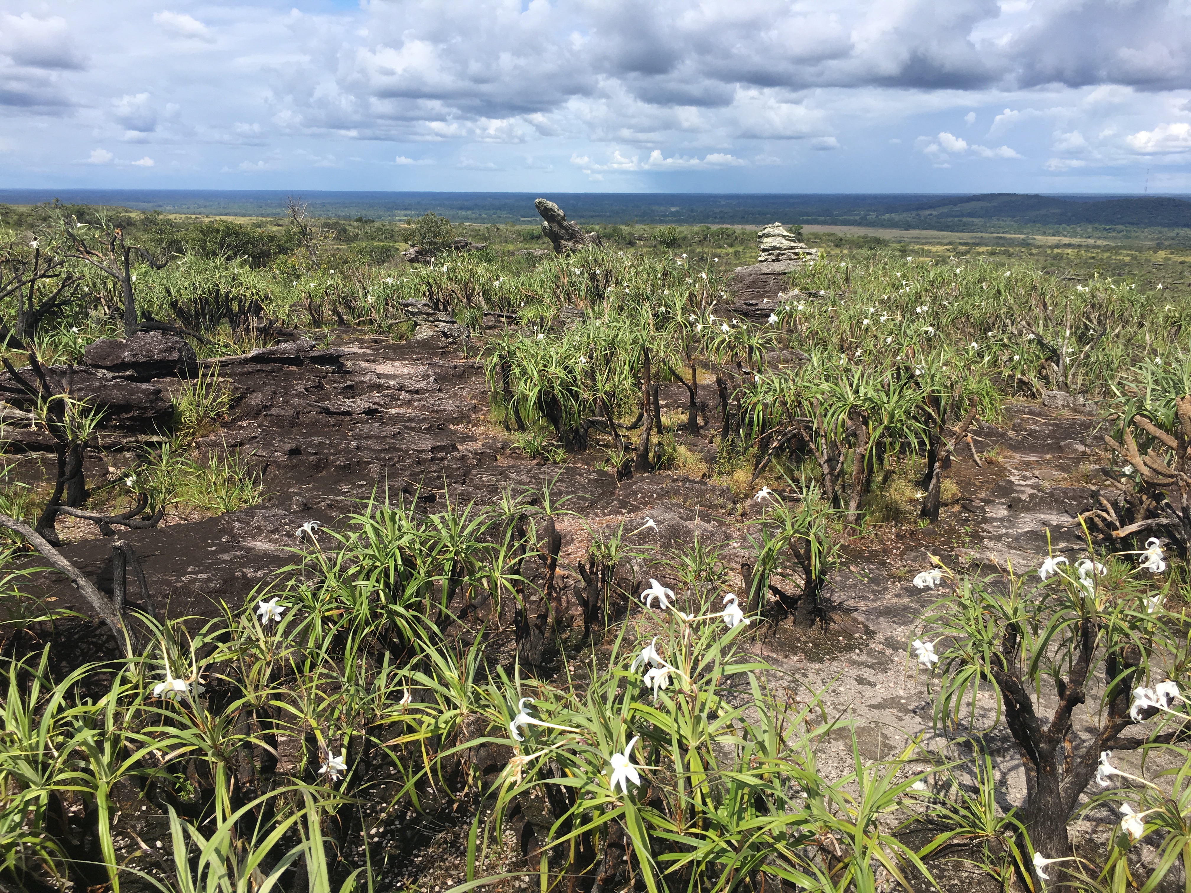 Proseguiamo attraverso collinette coperte di piante basse, con foglie grasse e lucide e fiori bianchi che sembrano fazzoletti. Qua e là, macchie nere interrompono il verde: terra bruciata e monconi di vegetazione carbonizzata. Sono le cicatrici lasciate dalle granate, ai tempi in cui le FARC combattevano in questa zona.
