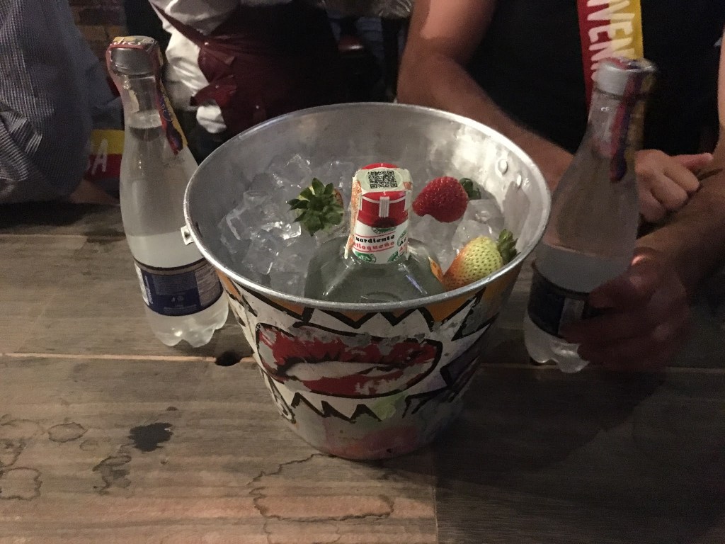 Appena entrati nel locale, ci mettono addosso delle fasce tipo Miss Colombia. Il posto è enorme, la musica (zarrissima) a tutto volume, e la gente balla persino sui tavoli. I nostri ospiti continuano a ordinare bottiglie di Aguardiente, impedendoci categoricamente di pagarne anche solo una.