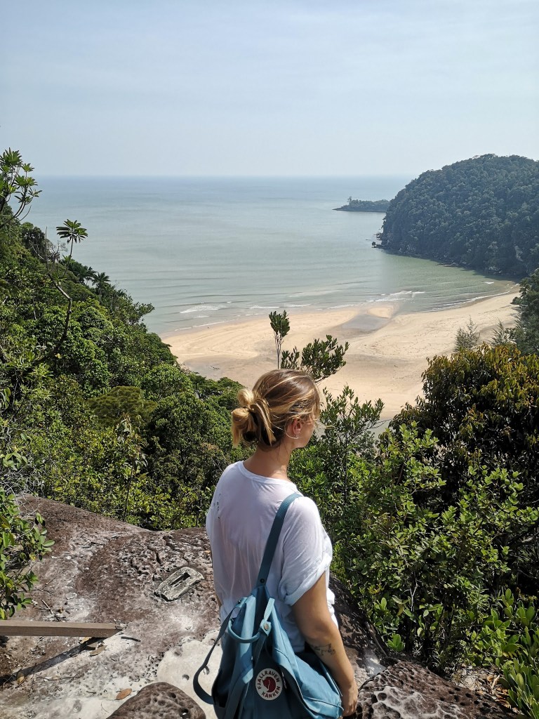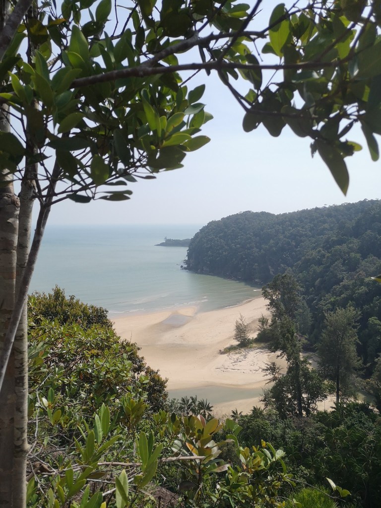 La prima parte del sentiero è semplice, quasi rassicurante, ma dopo poco la salita cambia tutto: terra, rocce, felci giganti, una cupola verde sopra la testa e la sensazione di essere finiti in un mondo lontano. Il caldo è opprimente, ma la bellezza intorno compensa ogni goccia di sudore. Poi, all’improvviso, la foresta si apre e ti trovi davanti Telok Pandan Kecil, una baia di sabbia bianca che si tuffa nell’azzurro incerto del Mar Cinese Meridionale. Da qui in poi si scende.